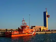 At the entrance of the port is a large tower for the officers of the Vessel Traffic Services (VTS). The tower provides the staff with a good view over the harbour entrance and the entire port area. The VTS is fitted with radar on top of the tower.