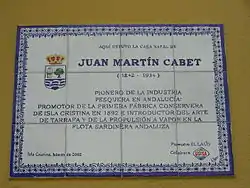 It was a salting businessman from Isla Cristina, Martín Cabet, the promoter of a new gear that he adapted to the galleon brought to Spain by himself from Boston, the tarrafa (purse seine gear dedicated to catching sardines).[5] Martin Cabet adapted it perfectly to the ship, propelled by oars (and later adapted it for steam propulsion) and with its larger dimensions, better maneuverability and allowing sets in deeper waters, it will overcome the restrictions imposed by Portugal in its jurisdictional waters without violating the 1883 treaty, fishing in its own waters without navigating them. In other parts of the province, it was preferred to trade with Portuguese sardines instead of fishing them, which reduced the dynamism and prevented the modernization of those ports, in addition to the risks involved, since Portugal also had an important canning industry.[5]
