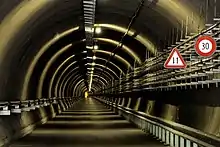 The multifunction station is located near a crossover between the northbound and southbound tunnels and is linked to the surface by an elevator, using 800 m (2,600 ft) tall shafts and a 1 km (0.62 mi) long access tunnel, exiting over the Anterior Rhine, south of Sedrun. This access was used for the construction of the tunnel and is now an emergency exit of the tunnel. Construction costs for a fully functional passenger station were estimated at CHF 50M ($39M, €32M, or £22M) in 2005[2] with annual operating costs of CHF 2.5M. It was initially projected to be opened in 2016 after the Base Tunnel was scheduled to come into service.