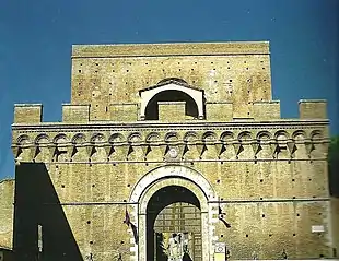 A small bastion stands beside the gate, added by Baldassarre Peruzzi,[5] between 1527 and 1532.