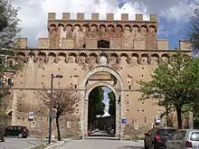 Porta Romana is one of the portals in the medieval Walls of Siena. It is located on Via Cassia in Siena, region of Tuscany, Italy. The gate exits near the Basilica of San Clemente and leads south out of town to Via Enea Silvio Piccolomini.