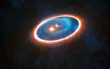 GG Tauri, often abbreviated as GG Tau, is a quadruple or quintuple star system in the constellation Taurus at a distance of about 450 light years (140 parsecs) away. Image is an artist's impression of the disk surrounding GG Tauri A and B.