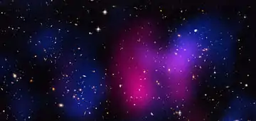 The Musket Ball Cluster (DLSCL J0916.2+2951) is a galaxy cluster that exhibits separation between its baryonic matter and dark matter components. The cluster is a recent merger of two galaxy clusters in Cancer constellation. This composite image shows the Chandra (red) and Hubble (yellow and white) observation data.