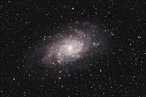 The Triangulum Galaxy (also known as Messier 33 or NGC 598) is a spiral galaxy approximately 3 million light-years away in the constellation Triangulum.