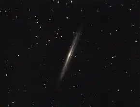 NGC 5907 is a spiral galaxy located approximately 39 million light years from Earth. It has an anomalously low metallicity and few detectable giant stars. The galaxy was discovered in 1788 by William Herschel. Supernova 1940A is in this galaxy.