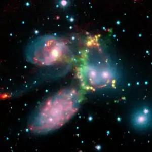 Stephan's Quintet is a visual grouping of five galaxies of which four form the first compact galaxy group ever discovered. The group was discovered by Édouard Stephan in 1877 at Marseilles Observatory. The group is the most studied of all the compact galaxy groups. The brightest member of the visual grouping is NGC 7320 that is shown to have extensive H II regions, identified as red blobs, where active star formation is occurring.