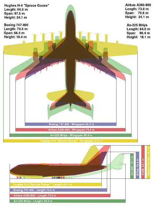 An overlay diagram showing four of the largest wide-body aircraft ever built, the Hughes H-4 Hercules (the "Spruce Goose", aircraft with the greatest wingspan), the Antonov An-225 Mriya (the largest freight aircraft), the Boeing 747-8 Intercontinental (soon to be the largest version of the Jumbojet), and the Airbus A380-800 (the largest passenger aircraft).