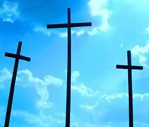 Three crosses against the azure sky is a classic type of outdoor Christian art.