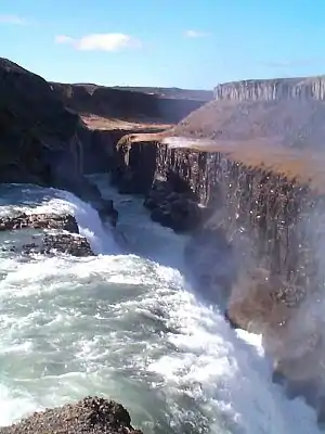 Iceland (Icelandic: Ísland, pronounced [ˈistlant] ( According to the ancient manuscript Landnámabók, the settlement of Iceland began in 874 AD when the Norwegian chieftain Ingólfr Arnarson became the first permanent settler on the island. In the following centuries, Norwegians, and to a lesser extent other Scandinavians, immigrated to Iceland, bringing with them thralls (i.e., slaves or serfs) of Gaelic origin. The island was governed as an independent commonwealth under the native parliament, the Althing, one of the world's oldest functioning legislative assemblies. Following a period of civil strife, Iceland acceded to Norwegian rule in the 13th century. The establishment of the Kalmar Union in 1397 united the kingdoms of Norway, Denmark, and Sweden. Iceland thus followed Norway's integration into that union, coming under Danish rule after Sweden seceded from the union in 1523. The Danish kingdom forcefully introduced Lutheranism to Iceland in 1550. (Full article...) Selected article -![]() Icelanders (Icelandic: Íslendingar) are an ethnic group and nation who are native to the island country of Iceland and speak Icelandic. Icelanders established the country of Iceland in mid 930 AD when the Althing (Parliament) met for the first time. Iceland came under the reign of Norwegian, Swedish and Danish kings but regained full sovereignty and independence from the Danish monarchy on 1 December 1918, when the Kingdom of Iceland was established. On 17 June 1944, the monarchy was abolished and the Icelandic republic was founded. The language spoken is Icelandic, a North Germanic language, and Lutheranism is the predominant religion. Historical and DNA records indicate that around 60 to 80 percent of the male settlers were of Norse origin (primarily from Western Norway) and a similar percentage of the women were of Gaelic stock from Ireland and peripheral Scotland. (Full article...)Selected picture![]() Gullfoss is a waterfall located on the Hvítá in south central Iceland. Its name means the "Golden Falls." The flow of the river from the regular rains and the glacial runoff, particularly in summer, makes Gullfoss the largest volume falls in Europe. News![]()