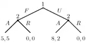 | A tree diagram of an extensive form game, used to formalize games with some important order of events |