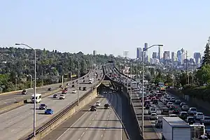 Interstate 80 is a major urban freeway though the East Bay, north of the Bay Bridge, in the San Francisco Bay Area (seen here in Berkeley, California).