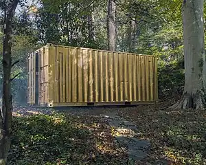 Portals is a global public art initiative that connects people around the globe through real-time video audiovisual technology housed inside a gold-painted, converted shipping container or other structure.[1][2][3] Individuals and groups enter local Portals and engage with individuals or groups in distant Portals through live, full-body video conferencing. The experience has been described as "breathing the same air."[4] Portals are placed in public spaces such as public squares, museums, university campuses, high-level summits, and refugee camps. Participation is free, and the spaces are maintained by staff called Portal_Curators.[5][6][3]