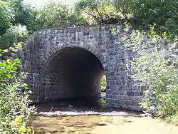 The Porter Hollow embankment is a 1400-foot-long earth structure, which contains a stone arch culvert passing over Stegman Creek. The culvert is made of cut fieldstone, and measures nineteen feet in width, seventy-five feet in length, and passes about nineteen feet above the water level in the creek below. The stonework rises six feet above the top of the arch, and continues onto wingwalls at each end. The top of the culvert is blacktopped as part of the trail.[2] An unusual feature of the culvert is that the bed of the creek below the culvert is lined with wooden planks.[4]