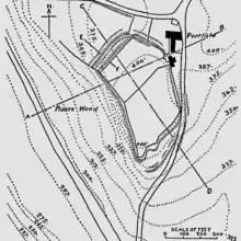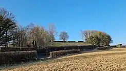It is located on a slight promontory overlooking the valley of the River Calder, with the ground falling particularly rapidly to the west. A flat, possibly artificially levelled area measuring approximately 165 by 110 metres (541 by 361 ft), appears to have originally enclosed by a single rampart, with a least one entrance on the northern side.[1] The irregularly-shaped site, with an area a little over 1.4 hectares (3.5 acres), is 120 metres (400 ft) above sea level. The surrounding land slopes fairly steeply on the southeast, and little less so on the northwest sides, while to the northeast the drop is only slight. No evidence remains of a bank on the western side and it could be that the slope here, which is most extreme on the upper 15 metres (50 ft), may have been considered defence enough.[2]
