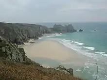 Porthcurno beach and bay, a few hundred yards south of the village is situated in the shelter of the Logan Rock headland just less than one mile (1.6 km) to the east. The beach is noted for its sand of crushed, white sea shells, privacy and isolation rather than movement of ships.[26][27][28] Porthcurno Bay has been described as "floored by glorious white sand that shines through translucent water".[29] Sometimes combinations of wind, tides and sea currents can change the 'sandscape' dramatically in a few hours, but the volume of sand is sufficient that it is unusual for the beach to be completely inundated by the sea at high tide. To the immediate east of Porthcurno beach, on the other side of Percella Point is a small tidal beach called Green Bay. Sometimes this is accessible with caution from Porthcurno beach at low tide.[3]