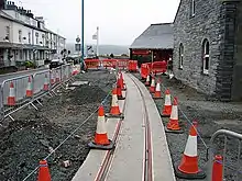 Having foreseen this problem, the FR proposed a £1.3M rebuild of Harbour Station, to provide two separate and individually controllable platforms, each with their own run-round loops. The project took three years to complete, requiring extension of the Cob structure into the Irish Sea, compacting, extension of the platform, and finally a shift westwards of the alignment of the existing single platform and FR storage loops and sidings. A helpful grant from the Terminal Stations Improvement Scheme was arranged by the Welsh Government. Completed in March 2014 within the projected cost,[1] the project delivered, as well as two platforms, a new electronically controlled signal box with a distinct FR heritage appearance. The signalling work won the Signalling Award at the 2014 National Railway Heritage Awards.[2]
