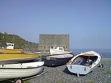 Porthoustock's proximity to The Manacles, a set of treacherous rocks which extend about 1-nautical-mile (1.9 km) east and south-east of Manacle Point, has been the location for numerous shipwrecks. The Royal National Lifeboat Institution (RNLI) stationed a lifeboat at Porthoustock in 1869 and built a boat house by the beach. An anonymous donor gifted a new lifeboat, Charlotte, on 23 September 1886.[2] The last boat stationed here was the Kate Walker which arrived in 1931. After it was sold in 1946 it was converted to a yacht and was reported as being at Felixstowe Ferry in 2007.[3] The station was closed in 1942 and has since become the village hall.[4]