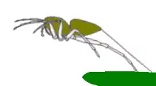 When not hunting for prey or a mate, Portia species, including P. schultzi,[5]: 31 adopt a special posture, called the "cryptic rest posture", pulling their legs in close to the body and their palps back beside the chelicerae ("jaws"), which obscures the outlines of these appendages. When walking, most Portia species have a slow, "choppy" gait that preserves their concealment: pausing often and at irregular intervals, waving their legs continuously and their palps jerkily up and down, moving each appendage out of time with the others,[7][8]: 6 and continuously varying the speed and timing.[9]: 418 P. schultzi uses what Forster and Murphy (1986) call a "lolloping" gait,[5]: 34-35 [2] flexing and stretching the legs. They suggest that the long legs are advantageous for moving through webs, and that lolloping enables P. schultzi to use the long legs while keeping the body near the surface.[5]: 34
