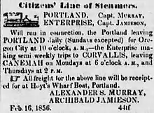As of February 16, 1856, Portland, still under Capt. Murray, had joined with the Enterprise, under Captain Archibald Jamieson, to run under the name of the Citizens' Line.[8] Portland ran every day except Sundays for Oregon City, leaving Portland from the Hoyt wharf boat at 10:00 a.m.[8] Above Willamette Falls, the Enterprise made semi-weekly trips to Corvallis, departing from Canemah on Mondays at 6:00 am., and Thursdays at 2:00 p.m.[8] This association continued at least through March 8, 1856.[9]