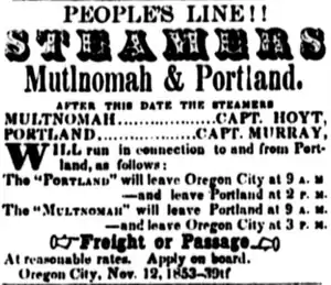 For a brief period starting in 1853 Portland, under captain A.S. Murray, and Multnomah, under Capt George W. Hoyt, were combined as the People's Line.[2][3][5] This was the first merger of steamboat interests on the river.[5] As of November 12, 1853 Portland would leave Oregon City daily at 9:00 a.m. for Portland, and leave Portland at 2:00 p.m. on the return trip to Oregon City.[6] Multnomah left Portland at 9:00 a.m. for Oregon City, and departed Oregon City in the afternoon, at 3:00 p.m. to return to Portland. As of April 21, 1855, under Capt. A.S. Murray, Portland was running on a daily route between Oregon City and Portland, departing Oregon City at 8:00 a.m., and leaving Portland at 2:00 p.m.[7]