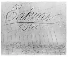 Several months were thus consumed; then came the day, as we discovered through the convenient knotholes, when another perspective drawing was made and transferred to the canvas, on the floor and to one side. The letters spelled Eakins. The name was not familiar to us."[4]