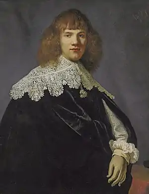 Jan Six lives in Amsterdam and showed the Christie's catalog entry to Ernst van de Wetering before booking a ticket to London to attend the sale.[10] The image struck him as being very Rembrandt-like. His main clue was the tentative date in the sale catalog of "1633-1635" while it was attributed to "circle of Rembrandt".[10] At that young age, Rembrandt didn't have a "circle" yet, so the painting was very possibly an original exemplar of "Rembrandt juvenalia", an area that has only in recent decades begun to be explored.[10] After viewing the painting and noticing the careful lacework, Six rushed over to the National Gallery to look at their Portrait of Philips Lucasz, dating from the same period and showing similar lacework.[10] The pendant portrait of that painting, Portrait of Petronella Buys, also contains lace and shows the same sort of background to both of the other paintings. It was sold by Christie's in the same saleroom for GBP 3,368,750 on 17 October 2017.[11]