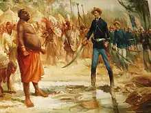 The Portuguese also made direct contact with the Kongolose vassal state Ndongo and its ruler Ngola Kiljuane in 1520, after the latter requested missionaries.[100] Kongolese king Afonso I interfered with the process with denunciations, and later sent a Kongo mission to Ndongo after the latter had arrested the Portuguese mission that came.[100] The growing official and unofficial slave trading with Ndongo strained relations between Kongo and the Portuguese, and even had Portuguese ambassadors from Sao Tome support Ndongo against the Kingdom of Kongo.[101][102] However, when the Jaga attacked and conquered regions of Kongo in 1568, Portuguese assisted Kongo in their defeat.[103] In response, the Kongo allowed the colonization of Luanda Island; Luanda was established by Paulo Dias de Novais in 1576 and soon became a slave port.[103][104] De Novais' subsequent alliance with Ndongo angered Luso-Africans who resented the influence from the Crown.[105] In 1579, Ndongo ruler Ngola Kiluanje kia Ndamdi massacred Portuguese and Kongolese residents in the Ndongo capital Kabasa under the influence of Portuguese renegades. Both the Portuguese and Kongo fought against Ndongo, and off-and-on warfare between the Ndongo and Portugal would persist for decades.[106]
