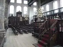 During the 1955–1959 renovation, the former Etz Hayim seminary auditorium was redesigned as a winter synagogue; central heating and electric lighting were added. The benches were taken from a synagogue originally built in 1639 and the Torah ark dates from 1744. The ark is made from a solid piece of jacaranda wood from Brazil and the main sanctuary does not have any internal electric system;[6] two chandeliers that hold 1000 candles are lit when necessary.[7]