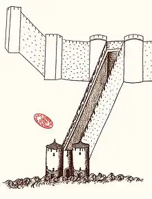 The Portuguese met some resistance on the beaches of Alcácer-Ceguer, where the garrison had erected barricades manned by crossbowmen and 500 horsemen, in order to prevent the Portuguese from landing.[1] They were however vigorously assaulted by a squadron commanded by Prince Henry the Navigator, and the Muslims forced back to the city.[1] The Portuguese were unable to breach through its gates, but later that night, the Portuguese used a bombard to demolish part of the city walls.[1]
