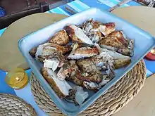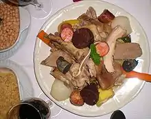 Many other meat dishes feature in Portuguese cuisine. In the Bairrada area, a famous dish is Leitão à Bairrada (roasted suckling pig). Nearby, another dish, chanfana (goat slowly cooked in red wine, paprika and white pepper) is claimed by two towns, Miranda do Corvo ("Capital da Chanfana")[25] and Vila Nova de Poiares ("Capital Universal da Chanfana").[26] Carne de porco à alentejana, fried pork with clams, is a popular dish with some speculation behind its name and its origin as clams wouldn't be as popular in Alentejo, a region with only one sizeable fishing port, Sines, and small fishing villages but would instead have a much popular usage in the Algarve and its seaside towns. One of the theories as to why the plate may belong to the Algarve is that pigs in the region used to be fed with fish derivatives, so clams were added to the fried pork to disguise the fishy taste of the meat.[27] The dish was used in the Middle-ages to test Jewish converts’ new Christian faith; consisting of pork and shellfish (two non-kosher items), Cristãos-novos were expected to eat the dish in public in order to prove they had renounced the Jewish faith.[28] In Alto Alentejo (North Alentejo), there is a dish made with lungs, blood and liver, of either pork or lamb. This traditional Easter dish is eaten at other times of year as well. A regional, islander dish, alcatra, beef marinated in red wine, garlic and spices like cloves and whole allspice, then roasted in a clay pot, is a tradition of Terceira Island in the Azores.