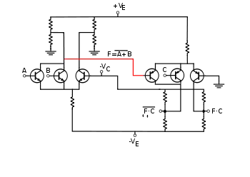 Beginning in the early 1960s, ECL circuits were implemented on monolithic integrated circuits and consisted of a differential-amplifier input stage to perform logic and followed by an emitter-follower stage to drive outputs and shift the output voltages so they will be compatible with the inputs. The emitter-follower output stages could also be used to perform wired-or logic.