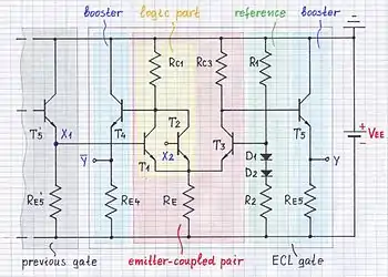In electronics, emitter-coupled logic (ECL) is a high-speed integrated circuit bipolar transistor logic family. ECL uses an overdriven bipolar junction transistor (BJT) differential amplifier with single-ended input and limited emitter current to avoid the saturated (fully on) region of operation and its slow turn-off behavior.[2] As the current is steered between two legs of an emitter-coupled pair, ECL is sometimes called current-steering logic (CSL),[3] current-mode logic (CML)[4] or current-switch emitter-follower (CSEF) logic.[5]