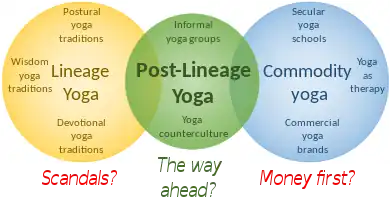 The ethnographer and yoga scholar-practitioner Theodora Wildcroft of SOAS University of London introduced the term "post-lineage yoga" to describe a contemporary form of yoga practised outside any major school or guru's lineage.[1] She defined it as follows: