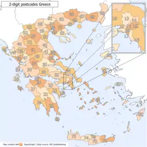 The Greek postal code system is administered by ELTA (Ελληνικά Ταχυδρομεία, Hellenic Post). Each city street or rural region has a unique five-digit number, its Ταχυδρομικός Κώδικας 'postal code' (ΤΚ). The first three digits identify the city, municipality or prefecture. In major cities, the final two digits identify streets or portions of streets.[1]
