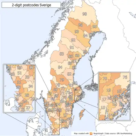 - Statistics Sweden has a detailed table of postcode, region, municipality and city here (invalid).