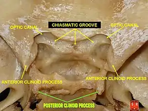 ![]() Sphenoid bone. Superior view. (Posterior clinoid process labeled at upper left.) | |