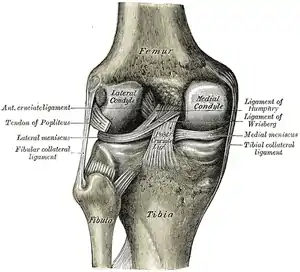 - Voos, JE.; Mauro, CS.; Wente, T.; Warren, RF.; Wickiewicz, TL. (Jan 2012). "Posterior cruciate ligament: anatomy, biomechanics, and outcomes". Am J Sports Med. 40 (1): 222–31. doi:10.1177/0363546511416316. PMID 21803977. S2CID 3524402.