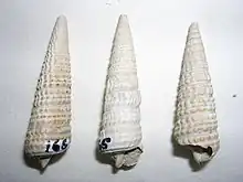 | Three fossil shells of Potamides migralis | |