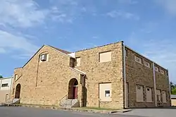It is a two-story 100 by 78 feet (30 m × 24 m) building built of coursed cream-colored native sandstone, with a roof that is flat and gabled and has parapets.[2]