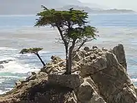 The Monterey Peninsula, discovery site of P. hickmanii, is in a native grassland opening within the Monterey pine forest. The peninsula is influenced by a marine climate that is pronounced due to the upwelling of cool water from the Monterey submarine canyon. Rainfall is 40 to 50 cm per year, but summer fog drip is a primary source of moisture for plants that would otherwise not be able to persist with such low precipitation. Some taxa, such as the coastal closed-cone pines and cypresses are relict stands, e.g. species that once extended more widely in the mesic climate of the late Pleistocene period, but then retreated to small pockets of cooler and wetter conditions along the coast ranges during the hotter, drier early Holocene period between 6000 and 2000 BC.[10]