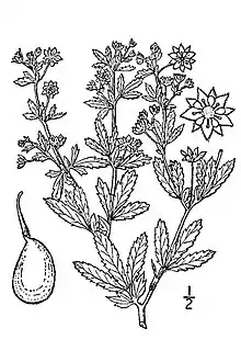 Potentilla rivalis is a species of cinquefoil known by the common names brook cinquefoil[1][2] and river cinquefoil. It is native to much of North America, including the southern half of Canada and the western and central United States. It grows in moist habitat, sometimes in disturbed areas. It is an annual or biennial herb producing upright stems up to half a meter tall from a taproot. The hairy leaves are divided into three to five leaflets which are lance-shaped to oval and lined with teeth. The inflorescence is a cluster of several flowers with tiny yellow petals no more than 2 millimeters long on a calyx of pointed sepals and bractlets which are slightly longer.