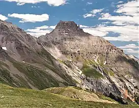Potosi Peak is a 13,786-foot-elevation (4,202-meter) mountain summit located in Ouray County of Colorado, United States.[3] It is situated five miles southwest of the community of Ouray, on land managed by Uncompahgre National Forest. It is part of the Sneffels Range which is a subset of the San Juan Mountains, which in turn is part of the Rocky Mountains. It is situated west of the Continental Divide, 2.2 miles south of Whitehouse Mountain, and 2.5 miles southeast of Mount Sneffels. Potosi ranks as the 113th-highest peak in Colorado,[2] and the fourth-highest in the Sneffels Range.[1] Recreation enthusiasts heading for Yankee Boy Basin traverse below the southern base of the mountain. Topographic relief is significant as the southeast aspect rises 4,000 feet (1,200 meters) above the Camp Bird Mine in approximately 1.5 mile. The mining activity in the immediate area produced significant amounts of gold and silver.[4] "Potosi" in Quechuan language translates to "great wealth.".[5] The mountain's name, which has been officially adopted by the United States Board on Geographic Names, was in use before 1899 when Henry Gannett published it in A Dictionary of Altitudes in the United States.[6]