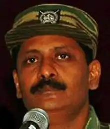 After recovering, Pottu Amman was put in charge of the Tiger Organization Security Intelligence Service (TOSIS), the LTTE's intelligence wing, in mid 1988.[5][11] Following the IPKF withdrawal in March 1990 and under Pottu Amman's leadership, TOSIS expanded greatly and became a formidable organisation, copying the tactics of Inter-Services Intelligence, Mossad and Shin Bet.[5][12] As chief of TOSIS, Pottu Amman is believed to have masterminded the assassinations of Rajiv Gandhi, Ranasinghe Premadasa, Ranjan Wijeratne, Clancy Fernando and many others.[1] He also played a key role in the unmasking of the "conspiracy" against LTTE leader V. Prabhakaran by deputy leader Mahattaya.[1] Pottu Amman is believed to have tortured Mahattaya and extracted his "confession".[5] In 1993 two separate divisions were created in TOSIS - National Intelligence Division and Military Intelligence Service.[5] Pottu Amman was in charge of the National Intelligence Division as well as being in overall charge of TOSIS.[5][12] He was later in charge of the LTTE's Chiruththaigal (leopard) commando division.[1][7] In 1997 he was appointed military commander of Jaffna peninsula.[1]