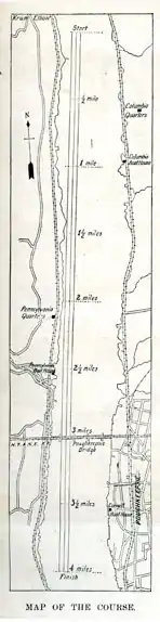 The very first IRA race was held in June 1895, on the Hudson River at Poughkeepsie, with one Varsity Eight team from Cornell, Columbia and Pennsylvania competing. Cornell won with a time of 21:25.0.[3] The course was a straight four miles, wide enough for 20 boats.[4] In 1899 there were 48 cars in the observation train that slowly followed the race as "a moving grandstand" (on the heights above the river).[5] People soon named the championship regatta after its permanent location and the name Poughkeepsie Regatta was used on the cover of the official program from 1922.[6]