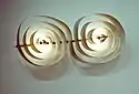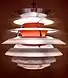 It was of the most expensive of Henningsen's lamps to produce because the paint and varnish work required 130 steps. It was discontinued in 1991.[68] This lamp was made up of ten lacquered metal shades. Each shade has four different colors: white, chrome, orange, and blue. The center rod that holds the bulb could be adjusted up and down. This allows the user to adjust the color temperature from cool to warm by moving the center rod. |