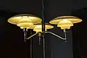 After the Paris exhibit, Louis Poulsen and Henningsen were awarded a contract to provide lighting for the newly constructed Forum building in Copenhagen. The building was planned to house an international car exhibition. Rather than using beam lighting, which would illuminate the cars' roofs and hoods but leave the sides of the vehicles dark, Henningsen iterated on the Paris Lamp design to create a lamp that would channel the light in oblique paths.[16] The Forum lamp had three shades, with diameter proportions of the shades following a 4:2:1 ratio. This ratio allowed the upper shade to reflect 50% of the light and the middle shade and bottom shade to reflect 25% each.[16] The lamp Henningsen created for Forum would be the basis for the three-shade system. The design was subsequently developed into a comprehensive system of lamps of different sizes, colors, materials, types (floor lamps, table lamps and chandeliers).[17]