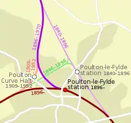 The original station was about 400 yards (400 m) north-east of the current location, at "The Breck".[1] The railway to the fishing town of Fleetwood passed along a straight line east of the town. From 1846, there was a junction to Blackpool just north of the station, with tight connecting curves facing either way. In 1893 a fatal accident occurred when a train took the curve too fast.[2][3] Subsequently, in 1896, the tracks were realigned to follow a much gentler westward curve to Blackpool, with the new station halfway along the curve. The Fleetwood branch then curved to the east to rejoin the original alignment. The old station continued to be used as a goods station until 1968.[4]