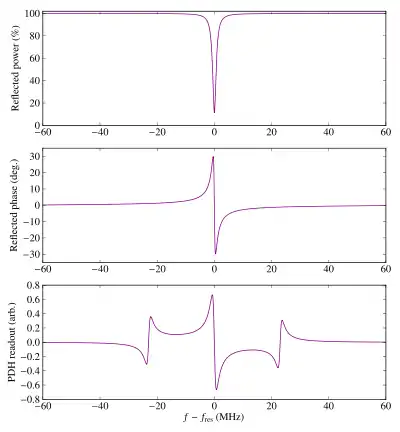 The PDH readout function gives a measure of the resonance condition of a cavity. By taking the derivative of the cavity transfer function (which is symmetric and even) with respect to frequency, it is an odd function of frequency and hence indicates not only whether there is a mismatch between the output frequency ω of the laser and the resonant frequency ωres of the cavity, but also whether ω is greater or less than ωres. The zero-crossing of the readout function is sensitive only to intensity fluctuations due to the frequency of light in the cavity and insensitive to intensity fluctuations from the laser itself.[2]