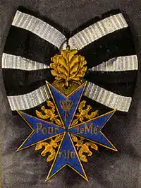 The Pour le Mérite was founded in 1740 by King Frederick II of Prussia.[8] It was named in French, which was the leading international language and the favoured language at Frederick's court.[9] The French name was retained, despite the rising tide of nationalism and increasing hostility between French and Germans during the 19th century, and indeed many of its recipients were honoured for acts performed in wars against France. The insignia of the military award was a blue-enameled Maltese Cross with golden eagles between the arms (which is based on the symbol of the Johanniter Order) and the Prussian royal cypher and the words Pour le Mérite ("For Merit" in French) written in gold letters on the body of the cross. The ribbon was black with edge stripes of silver-white. The order consisted of only one class, both civil and military, until 1810.[10] Only a few civilians were honored: Pierre Louis Maupertuis (1747),[11] Francesco Algarotti (1747)[12] and Voltaire (1750).[13][14][15]