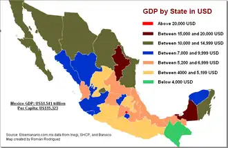 The high numbers of poverty in the country, despite Mexico's positive potential is a recurrent topic of discussion among professionals.[8] Some economists have speculated that in four more decades of continuous economic growth, even with emigration and violence, Mexico will be among the five biggest economies in the world, along with China, the United States, Japan, and India.[9]